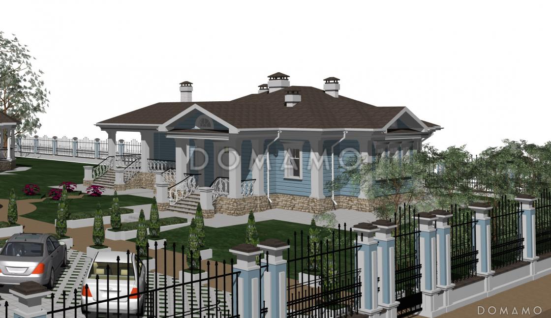 Баня площадью 132 кв.м с барбекю на террасе — идеальное место для отдыха большой компанией. В здании размещены 2 санузла, душевая, парная и даже спортзал. В проекте имеются также кухня, столовая и кладовая. Строение из кирпича облицовано деревянной вагонкой.