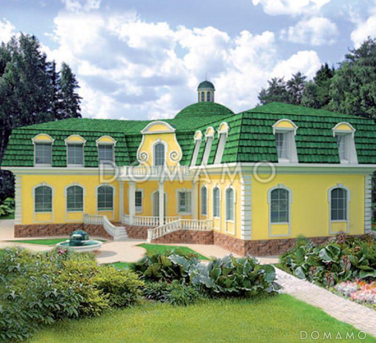 Проект царской резиденции, выполненный в присущем таким зданиям цвете: зеленом и желтом. Планировка дома неповторима и шикарна, в ее основе полукруглый эркер, который дублируется с противоположной стороны строения, венчает его круглая крыша с небольшой башенкой. Все это великолепие составляет в целом около 500 м2, уникально изогнутые украшения на окнах, колонны с римской капителью. В небольших окнах установлены решетки, что еще больше подчеркивают все великолепие замысла. Крыльцо поражает вычурностью форм, в дом ведут сразу две лестницы.