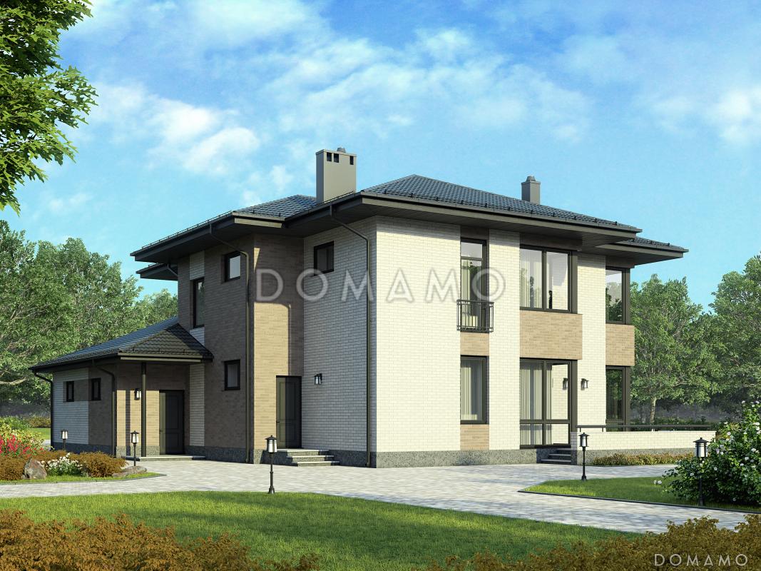 Двухэтажный особняк в европейском стиле, который подойдет для жизни большой семьи из пяти-шести человек. Панорамные окна, расположенные по всему периметру дома, делают экстерьер очень элегантным. В проекте также предусмотрено наличие большого гаража с двумя парковочными местами.