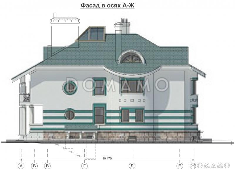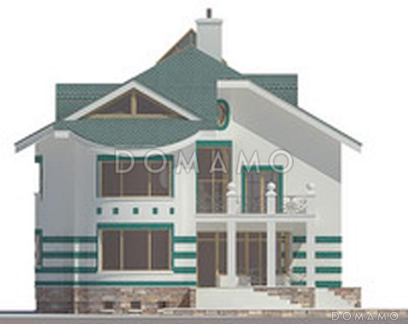 Оригинальный особняк предназначен для комфортабельной жизни семейной пары с 1-2 детьми. Экстерьер обращает на себя внимание фасадами неправильной формы с выступами, балконами и круглыми окнами.