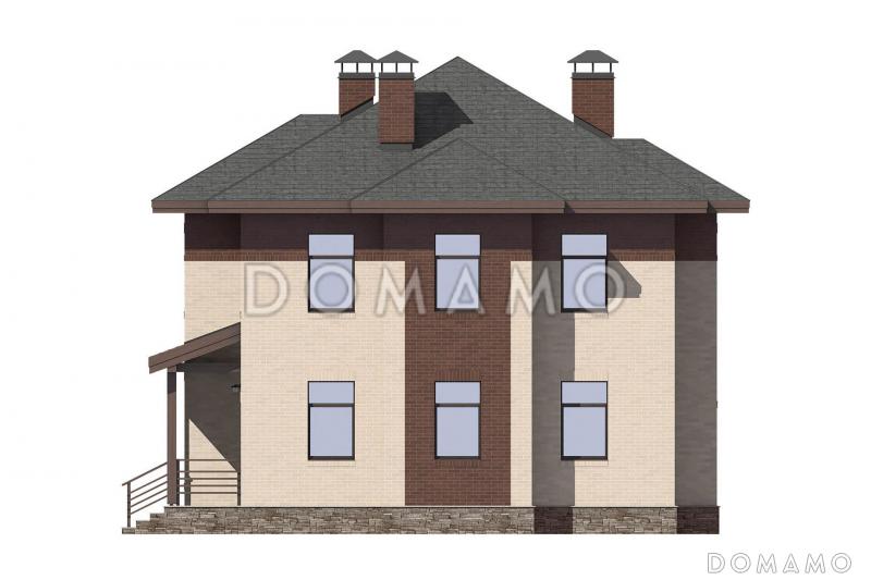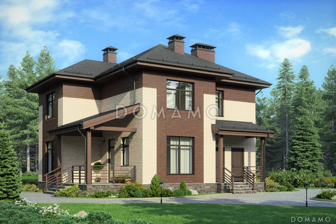 Проект двухэтажного коттеджа из кирпича в европейском стиле отлично подойдет для проживания в нем большой семьи. Внешний вид дома выделяется необычной формой крыши, сочетанием красного и белого облицовочного кирпича в отделке и большими окнами, расположенными по всему периметру здания. На первом этаже находится большая гостиная с камином и выходами в кухню – столовую, а также на террасу, гостевая комната и техническое помещение. Второй этаж занимают три спальных комнаты и помещение, отведенное под кабинет.