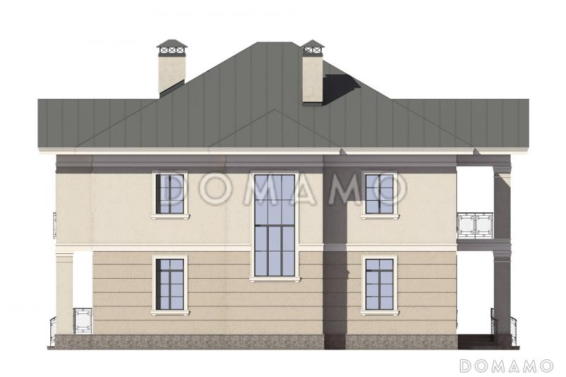 Большой двухэтажный коттедж, выполненный в классическом стиле, прекрасно подойдет для постоянного проживания в нем большой семьи из пяти – шести человек. Проект дома предусматривает два симметричных входа в помещение, у каждого из которых расположено по просторному крыльцу. Здание украшают массивные колонны, делающие его внешний вид еще более эффектным. С боковых сторон дома расположены панорамные окна. Большую часть первого этажа занимает большая гостиная, объединенная с кухней-столовой, где предусмотрено место под камин. Здесь же находится гостевая комната и кладовая. На втором этаже расположены спальни, в том числе мастер-спальня с выходом в большую гардеробную и на балкон, а также кабинет.