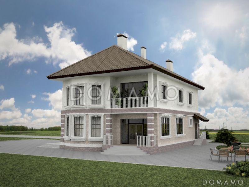 Большой дом с арочными окнами смотрится величественно благодаря вертикальной ориентации архитектурных элементов, арочным проемам и эркерным зонам. Внутреннее пространство отличается наполнением естественным светом, который дают застекленные выступающие участки постройки и устройство второго освещения в гостиной. Несмотря на внешнюю грандиозность здания, внутри него царят уют и комфорт: