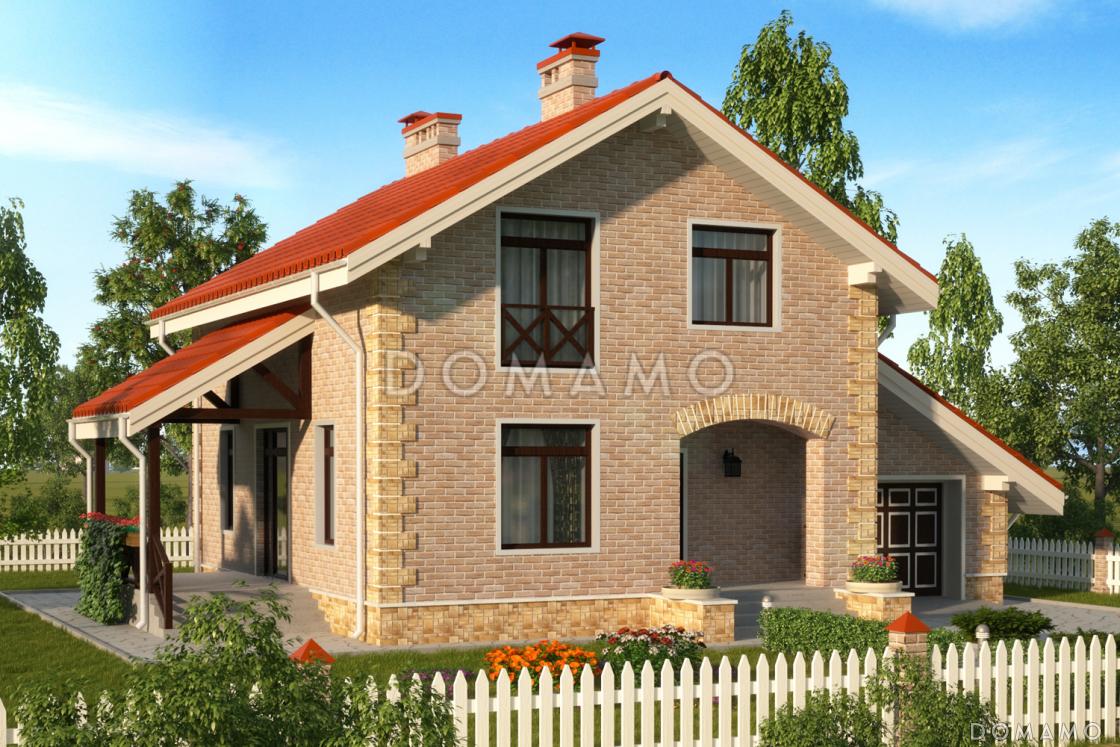Загородный дом из пеноблоков для семьи из 3-4 человек. Оформление крыши натуральной черепицей, а стен – облицовочным кирпичом, в сочетании с контрастным обрамлением окон, придает коттеджу яркий и запоминающийся внешний вид.