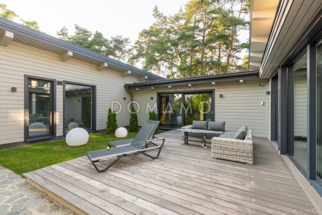 Проект одноэтажного каркасного дома в скандинавском стиле. Отличительная особенность — наличие внутреннего дворика за счет П-образной формы дома.