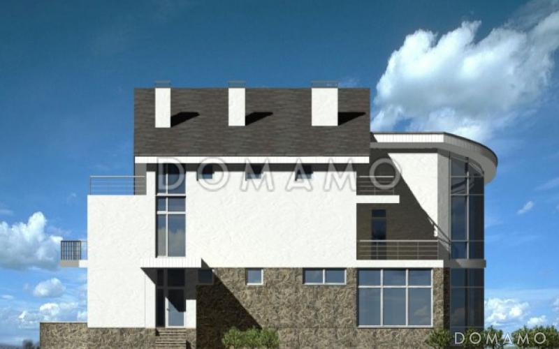 Оригинальный дом в современном стиле с масштабным остеклением и округлыми очертаниями фасада имеет четыре спальни и подойдет для семьи из 4-5 человек. Здание построено из кирпича, нижний этаж облицован декоративным камнем.