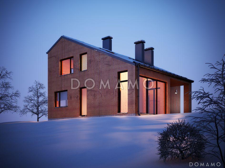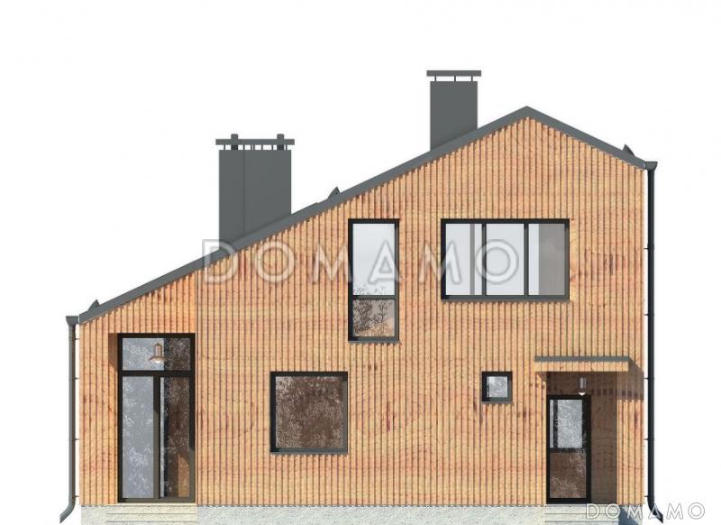 Коттедж с тремя спальнями подойдет для семьи из 3-4 человек. Оригинальность фасаду придает обшивка деревянной вагонкой в вертикальном направлении, а также асимметричная двускатная крыша.