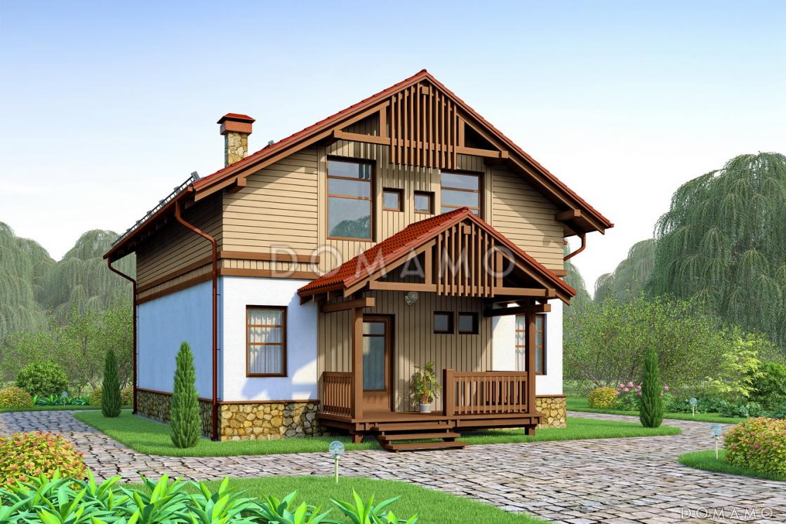 Двухэтажный домик с мансардной крышей станет удобной дачей или местом круглогодичного проживания семьи из 3-х — 7-ми человек. Оформление «под дерево» дает ему особое очарование и близость к природе, панорамные и мансардные окна обеспечивают естественное освещение комнат. Строительство из каркасных конструкций ускоряет процесс возведения и делает дом энергоэффективным, а планировка предусматривает максимальное использование площади: