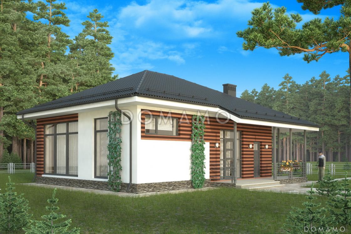 Компактный, но просторный одноэтажный дом из теплого ячеистого бетона — пенобетона с большой спальней (16,3 кв. м.) и кухней-гостиной разделенной на функциональные зоны. В проекте заметны мотивы европейского шале, также по-европейски рационально разделены жилая и техническая часть помещений, в которых нашлось место и для просторной ванной комнаты. Одной из особенностей проекта является его большая терраса, буквой Г огибающая фасад здания — достаточно большая для размещения летней мебели для отдыха.