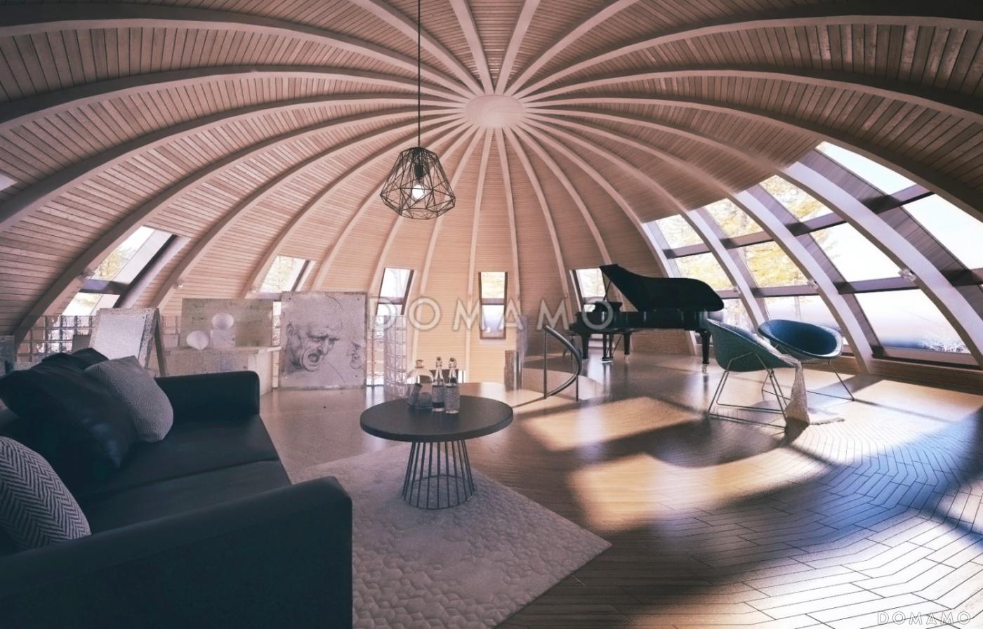 Компания Domamo предлагает проект сферического дома с большой гостиной с панорамным остеклением D758. Общая площадь - 240 м2, размер - 13.5х13.5 м. Фундамент - свайный, кровля - гибкая черепица, внешняя отделка - кровельный материал. Для заказа проекта или внесения изменений свяжитесь с нами с помощью форм обратной связи на сайте или по телефону +7 (343) 357-92-70.