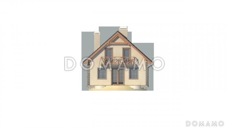 Вариант утонченного кирпичного дома с двухскатной крышей и повторяющий ее очертания навесом над крыльцом будет уместно установить как в черте города, так и за ней. Его экстерьер украшают декоративно выполненные углы, а также окна с узкими перегородками. Здание одноэтажное, но мансарда выполнена жилой, она полностью заменяет обычный этаж. На мансарде предполагается три спальных зоны и ванная с санузлом. Внизу большую часть отведенной площади занимает гостиная в 34,8 м2, двойная дверь из которой ведет на широкую террасу. Квадратная кухня позволяет удобно расположить мебель и обустроить обеденную зону.