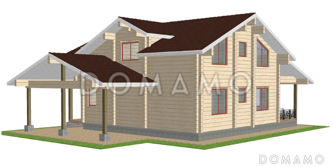 Дом из бруса общей площадью в 255 м2 сможет стать родовым гнездом семье из 5-7 человек. Внушительные размеры постройки позволяют комфортно существовать на удачно продуманной планировке. С крыльца идут две двери: одна в топочную, а вторая в сам дом. В большом тамбуре имеется дверь в отдельную гардеробную, холл объединяет собой гостиную, санузел, кухню с отдельной кладовой, а также лестницу, ведущую на мансардный этаж, рядом с которой расположена спальня. Под крышей расположились 4 спальни, 2 кладовки и 2 санузла.