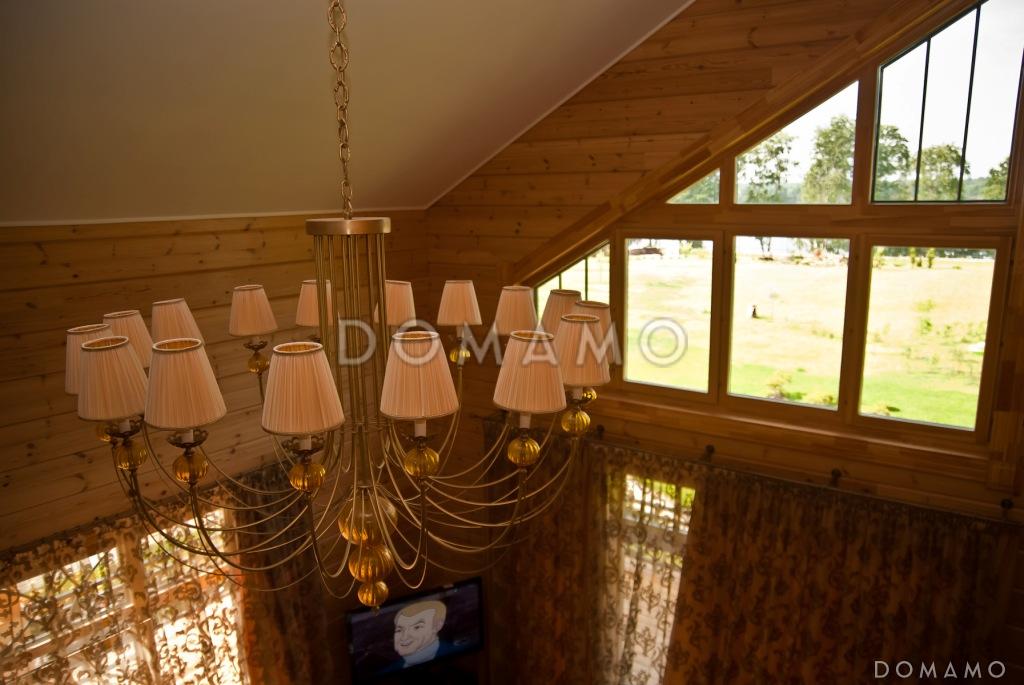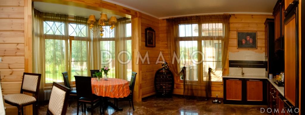 Массивное деревянное здание, в котором скрыт целый СПА-комплекс, наполнено всеми архитектурными фишками: эркер, выступающие стены, крытая терраса со стеклянной крышей, крытые балконы, украшенные, как и терраса, коваными ограждениями. Огромная кухня-столовая (29 м2), гостиная с примыкающей к ней Г-образной террасой, отдельная котельная и гардеробная. На противоположной стороне здания, если миновать комнату отдыха в 36,5 м2, попадаешь в большой бассейн, возле которого имеется сауна и душевая. Наверху три спальни и столько же балконов, библиотека и санузла.