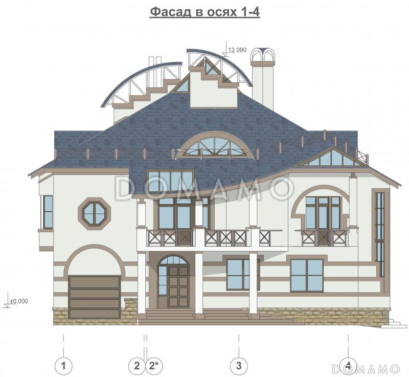 Оригинальный коттедж с гаражом для семьи из 3-4 человек. Фасады в современном стиле оформлены окнами неправильной формы, выступами и лаконичными колоннами.