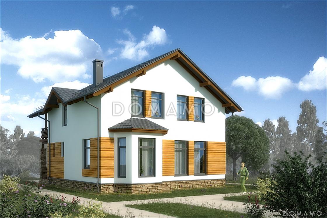 Большой двухэтажный дом с типичным для современных проектов четким разделением жилой и функциональной зон. Особенностью же является совмещенное пространство кухни и гостиной, со светлым эркером, расположенным в кухонной зоне — великолепный обзор вместе с естественным светом и теплом. Жилая зона состоит из жилой комнаты на первом этаже и трех спален с кабинетом на второй, последний имеет выход на просторный балкон, где можно удобно разместить столик и другую летнюю мебель для отдыха.