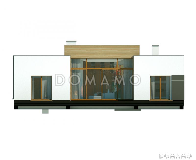 Одноэтажный дом с оригинальными фасадами и современным оформлением подойдет для семьи из трех-четырех человек. Экстерьер украшают окна в пол и просторная открытая терраса позади дома.