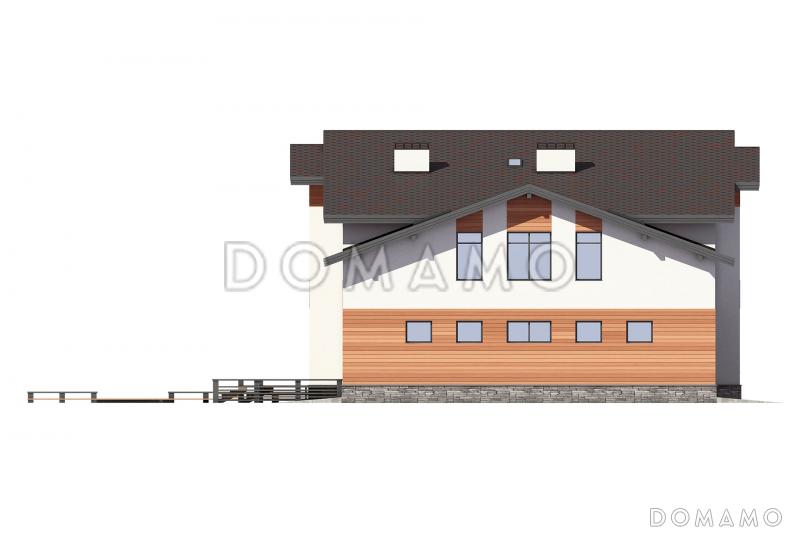 Проект современного двухэтажного коттеджа, который отлично подойдет для проживания в нем большой семьи из пяти – шести человек. Внешний вид дома отличает необычная планировка, интересные элементы из деревянной вагонки, используемой в облицовке здания, а также большое количество панорамных окон. Проект предусматривает наличие большого гаража внутри дома. На первом этаже, помимо него, расположены просторная гостиная-кухня-столовая, холл и кабинет. Второй этаж включает в себя три спальни, каждая из которых имеет выходы в собственные гардеробные и ванные комнаты, второй кабинет, две просторных кладовых и большое помещение игровой, где можно расположить бильярд, настольный теннис или что-либо еще на усмотрение хозяев дома.