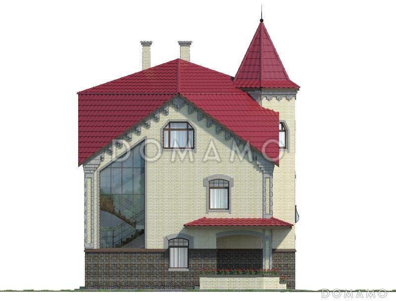 Необычный, но гармоничный проект дома из газобетона для большой семьи, рассчитанный на любителей нестандартных архитектурных решений. Проект дома создавался с опорой на элементы готического стиля: полубашня-эркер в качестве акцента парадного фасада, характерная форма кровли. Отметим наличие большой террасы закрытой с двух сторон зданием. Общесемейная зона первого этажа — это большая и светлая кухня-столовая с эркером, также на первом этаже: просторный кабинет, санузел, прихожая и котельная. Гостиная находится на втором этаже, из пяти спален — 2 на втором и 3 на третьем. Уровни соединены удобной маршевой лестницей с площадками.