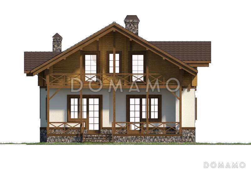 Достаточно просторный дом (98,3 кв. м. жилой площади) в стиле альпийского шале. Каменная облицовка первого этажа и деревянная второго, большие свесы крыши. Дом подойдет для постоянного проживания семьи из 4-5 человек. Первый этаж занимают просторная гостиная и отдельное помещение кухни, каждое из них имеет свой выход на большую террасу. Также нужно отметить, что имеется гостевая (кабинет), котельная, тамбур, прихожая и санузел. Второй этаж — три спальни, санузел и ванная комната. Из двух спален имеется выход на большой балкон, во всю ширину заднего фасада, с которого будет открываться отличный вид на ваш участок.
