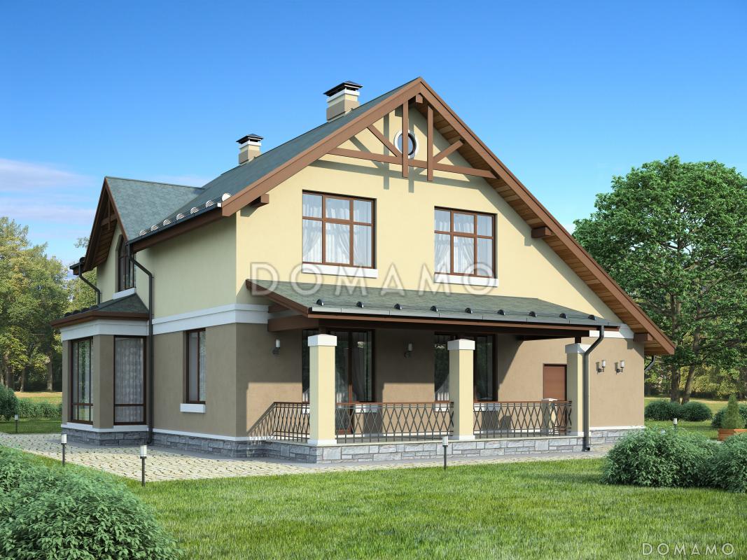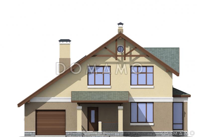 Проект современного двухэтажного коттеджа из пеноблоков, который отлично подойдет для проживания в нем семьи из пяти-шести человек. Визуально дом поделен на две части, так как в отделке используется декоративная штукатурка двух разных пастельный оттеков – более темного для первого этажа и более светлого - для второго. Это создает приятную контрастность во внешнем виде постройки. Дом также украшает эркер и большое количество панорамных окон на мансардном этаже. Первый этаж включает в себя большую кухню-столовую, гостиную, а также гостевую комнату и гаражное помещение с двумя парковочными местами. Здесь же расположена крытая терраса. Второй этаж занимают три спальных комнаты и ванная с санузлом.