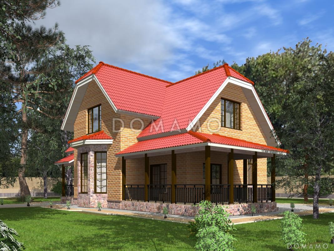Мансардный домик из пенобетона с отделкой под кирпич выглядит как игрушка на фоне загородного пейзажа. Дополнительное очарование ему придает большая крытая терраса, на которую можно выйти прямо из кухни-столовой. Здесь хорошо устроить летнюю зону отдыха с креслами и столом. Прекрасный вид на сад открывается также из высоких окон гостиной, расположившихся по периметру полукруглого эркера. Здесь можно собираться всей семьей, а персональная зона отдыха представлена 4-мя спальнями. Одна из них для удобства жильцов запроектирована на первом этаже, через холл с сауной и вторым санузлом.