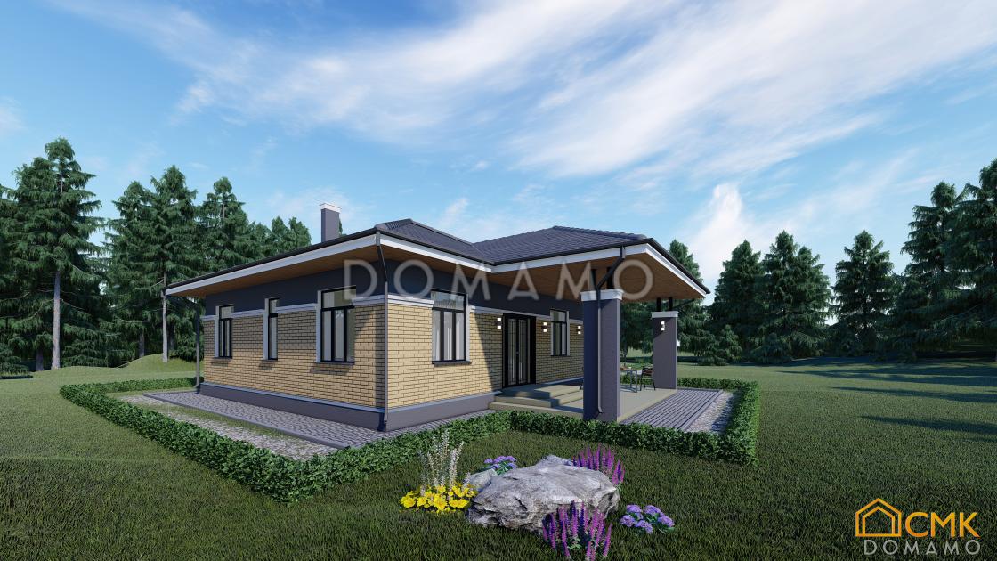 Небольшой дом, подойдет для узких участком. Тем не менее в нем есть все необходимое. Просторная кухня-гостиная, две большие спальни, санузел и гардероб.