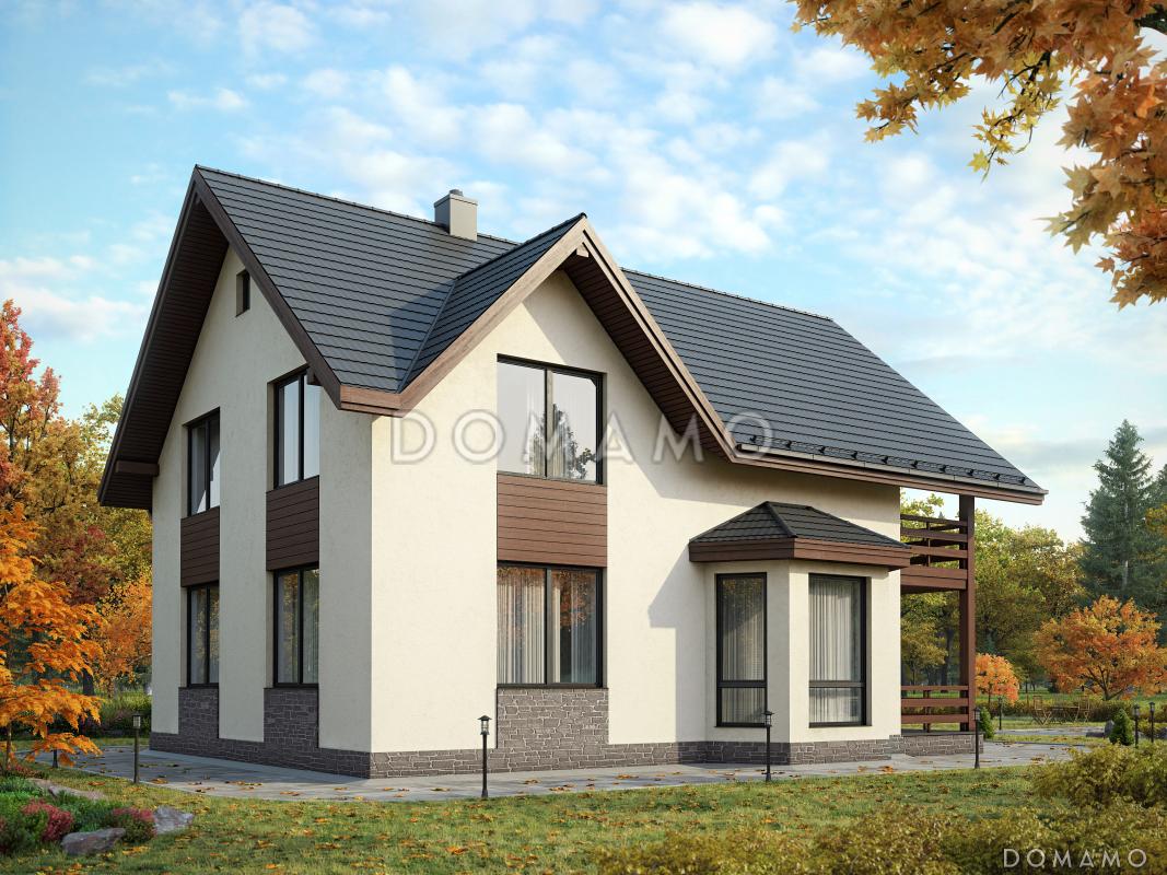 Коттедж с четырьмя просторными спальнями подойдет для семьи из 4-5 человек. Передний фасад дома украшают массивные балки и ограждения террасы и балкона.