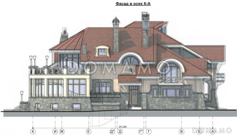 Проект особняка в стиле модерн для комфортабельной жизни за городом семьи из 4-5 человек. Сложный экстерьер обращает на себя внимание: полукруглые окна, многоуровневая крыша сложной формы, эркеры, затейливые ограждения балконов и террас.